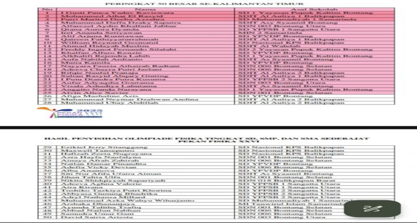 Kemudian setelah dilaksanakan kegiatan tersebut keluarlah pengumuman hasil dari olimpiade yang menyebutkan bahwa Santri MI Tanwirul Islam masuk pada peringkat 50 besar se-Kalimantan Timur dan menjadi perwakilan kota untuk melanjutkan ke semifinal olimpiade Fisika.